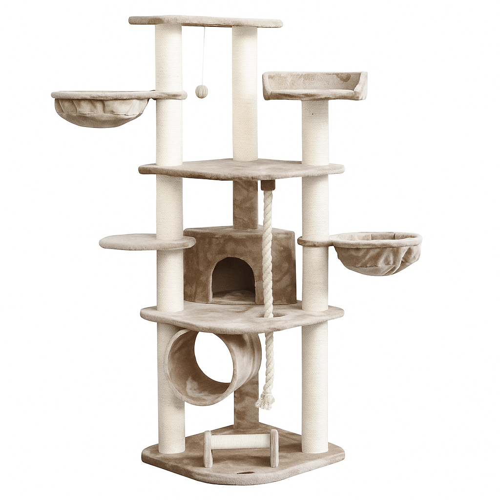 !!! DOPRAVA ZDARMA !!! NOVÉ KOČIČÍ ŠKRABADLO XXL BÉŽOVO-ŠEDÉ se sisalovými kmeny Ø 15 cm VHODNÉ PRO VELKÉ A TĚŽKÉ KOČKY BÉŽOVO-ŠEDÉ - VYSOKÉ 189 cm OÁSA, RELAXACE A ZÁBAVA PRO KAŽDOU KOČKU Nuda, nečinnost, dlouhá chvíle? S nákupem tohoto škrabadla toto Vašim chlupáčům opravdu nehrozí! Toto víceúrovňové škrabadlo v béžovo-šedé barvě nabízí vše, co váš chlupatý společník potřebuje – pohodlí, zábavu i prostor pro pohyb. Měkké pelíšky poskytnou místo pro lenošení. Prolejzací otvor se postará o spoustu zábavy. Stabilní sisalové kmeny a škrábací prkno umístěné na základní desce poslouží ke škrábání a obrušování dápků. Díky stabilní extra zesílené základně a promyšlenému uspořádání plošin je škrabadlo vhodné jak pro větší a těžší kočky, tak i pro domácnost s více kočkami. Barva: Béžovo-šedá Výška: 189 cm Jednotlivé prvky: Prostorné odpočinkové vyhlídkové plochy – perfektní výhled na celé teritorium Vrchní odpočinková plocha s prohloubeným košíkem - perfektní na schoulení a schování se Odpočinková vyhlídková plocha s vysokým měkkým plyšovým okrajem Prostorné odpočinkové košíky - ideální pro lenošení a spánek Sisalové sloupky – bytelné a masivní, vhodné i pro velká plemena Prolejzací otvor – pro každodenní zábavu a aktivitu Škrábací prkno na základně Extra stabilní zesílená základní deska Detailní rozměry: Celkové rozměry: 189 x 61 x 71 cm Základní plocha: 71 x 61 x 4 cm Sisalové kmeny: Ø 15 cm Vrchní odpočinková plocha s prohlubní: Ø 60 cm, prohluběň Ø 30 cm Odpočinková vyhlídková plocha uprostřed: 71 x 61 cm Postranní plochy k sezení: 60 x 35 cm, 1x s prolejzacím otvorem Odpočinkové košíky: Ø 40 cm Kulatá vyhlídková plocha s měkkým okrajem: Ø 45 cm Toto škrabadlo je navrženo tak, aby vyhovovalo nárokům velkých a těžkých koček, popř. nárokům domácností s více kočkami. Vhodné pro: ✅ Velká plemena (Mainská mývalí, Ragdoll, Norská lesní aj.) ✅ Domácnosti s více kočkami ✅ Aktivní kočky, které rády šplhají a pozorují okolí